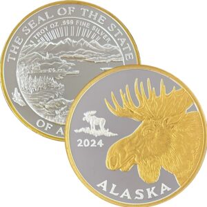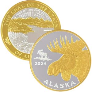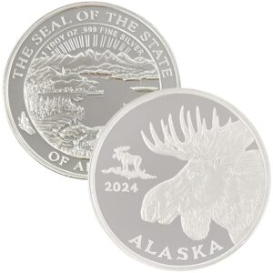 The 2024 Official State Medallion was designed by Alaskan artist, Ira Levinton. Ira also designed several earlier years of these medallions. These medallions are 1 oz proof silver and are packaged in a box and airtite container. We also mint a 2 oz. “Alaska Size” version of this medallion that is a full 2 inches in diameter, in both silver and double gold relief. The Official State Medallions are the only medallions that we mint that feature the Seal of the State of Alaska on the reverse!