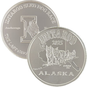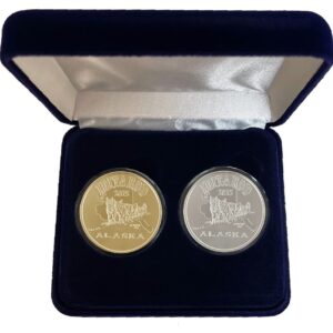 This medallion is available in golden bronze, 1 oz .999 fine silver, 1 oz single gold relief (24k plating on front of the silver coin) and 1 oz double gold relief (24k gold plating on both sides). The 1 oz medallion is similar in size to a silver dollar. They are packaged in an airtight container and handsome gift box. The reverse is the Official logo of Iditarod.