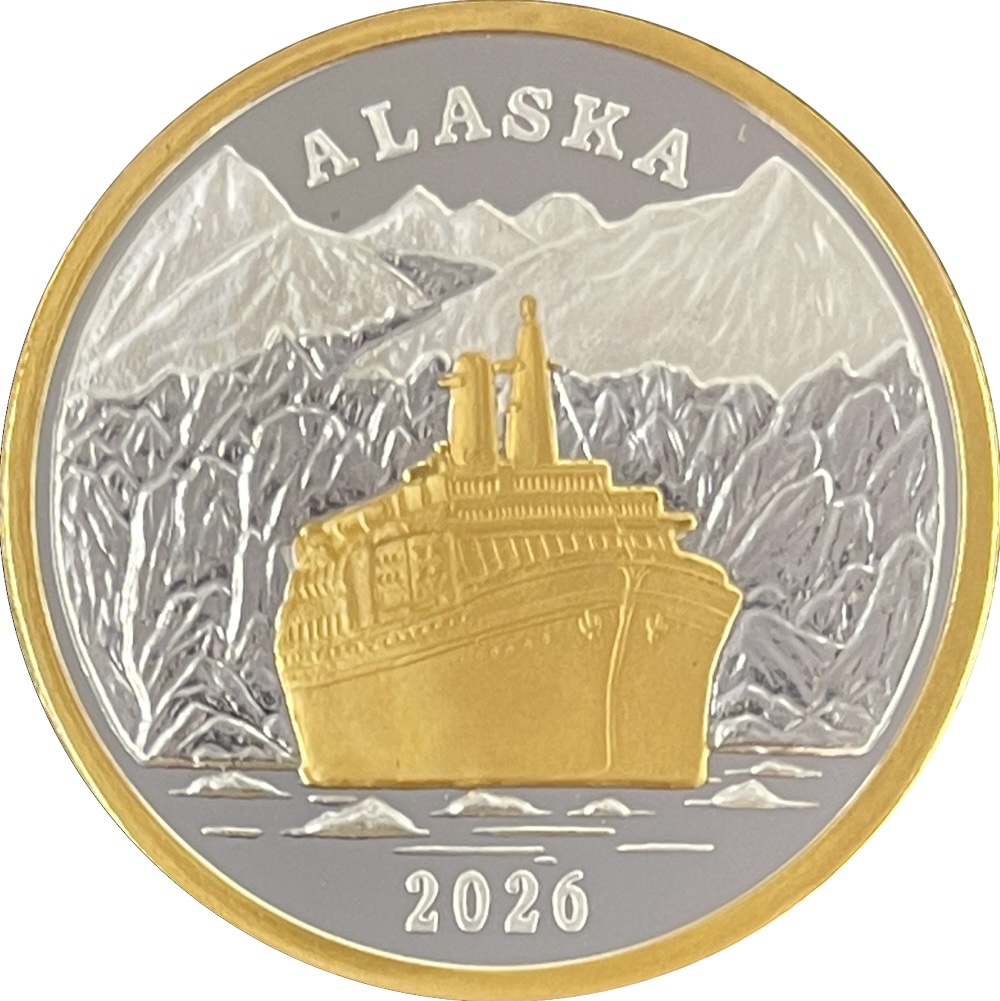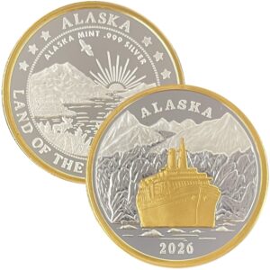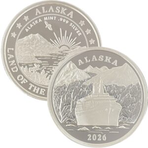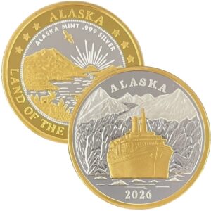 This medallion is available in golden bronze, 1 ounce .999 fine silver, 1 oz single gold relief (24k plating on front of the silver coin) and 1 oz double gold relief (24k gold plating on both sides). It is similar in size to a silver dollar and comes packaged in an airtight container and handsome gift box. The reverse features our popular “Land of the Midnight Sun” design.