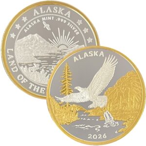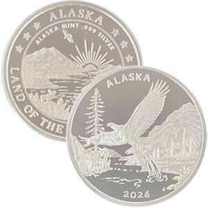 These medallions are minted in golden bronze, 1 oz .999 fine silver, 1 oz single gold relief (24k plating on the front of the silver coin) and 1 oz double gold relief (24k gold plating on both sides). The 1 oz medallion is similar in size to a silver dollar. They are packaged in an airtight container and handsome gift box. The reverse features our popular “Land of the Midnight Sun” design.