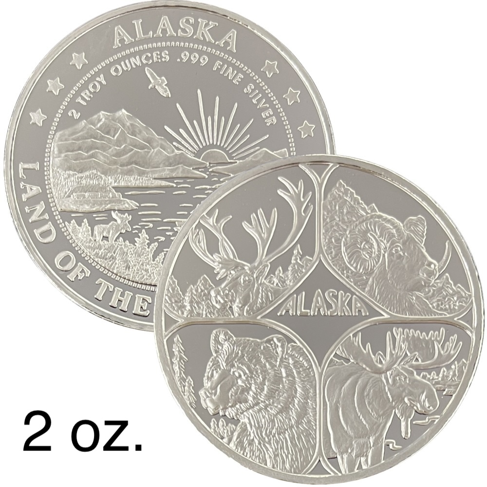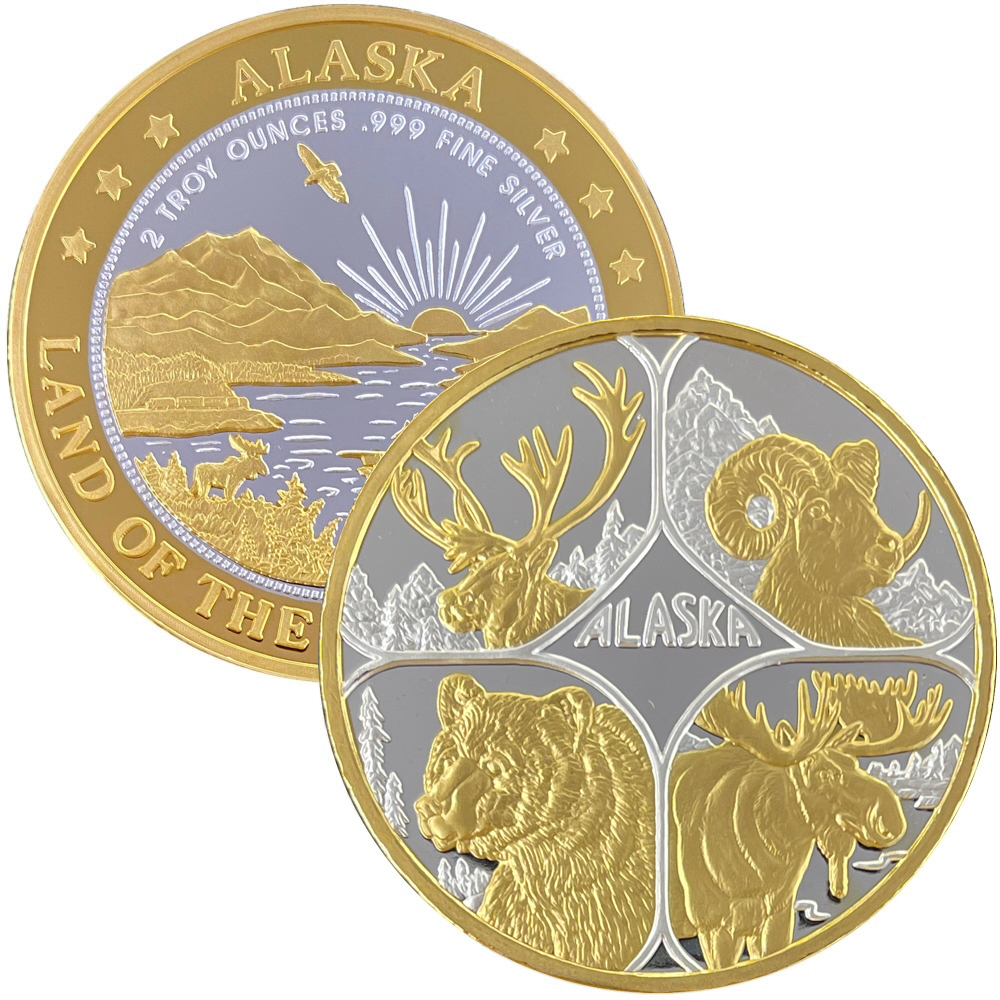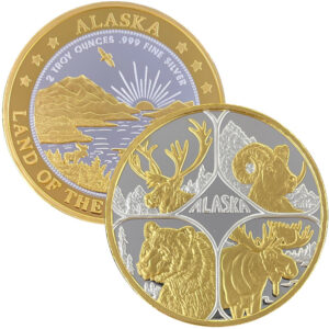 These medallions are made of 2 oz .999 fine silver, and 2 oz double gold relief (24k gold plating on both sides). They are two inches in diameter and come packaged in an airtight container and handsome gift box. The reverse features our popular “Land of the Midnight Sun” design.