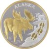These medallions are available in golden bronze, 1 oz .999 fine silver, 1 oz single gold relief (24k plating on the front of the silver coin) and 1 oz double gold relief (24k gold plating on both sides). It is similar in size to a silver dollar and comes packaged in an airtight container and handsome gift box. We also mint a 2 oz. “Alaska Size” version of this medallion that is a full 2 inches in diameter, in both silver and double gold relief. The reverse features our popular “Land of the Midnight Sun” design.