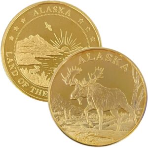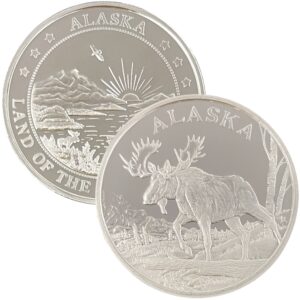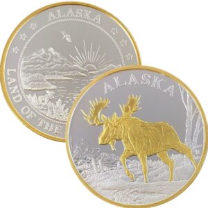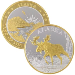 Our Bull Moose coin is our newest moose design. This medallion features a magnificent bull moose in an Alaskan landscape. This medallion is available in golden bronze, 1 oz .999 fine silver, 1 oz single gold relief (24k plating on the front of the silver coin) and 1 oz double gold relief (24k gold plating on both sides). It is similar in size to a silver dollar and comes packaged in an airtight container and handsome gift box. The reverse features our popular “Land of the Midnight Sun” design.
