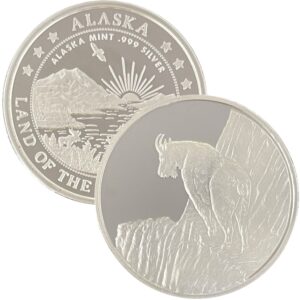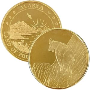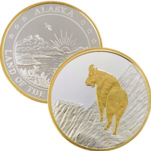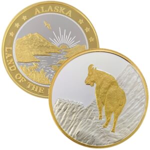 This medallion is available in golden bronze, 1 oz .999 fine silver, 1 oz single gold relief (24k plating on the front of the silver coin) and 1 oz double gold relief (24k gold plating on both sides). It is similar in size to a silver dollar and comes packaged in an airtight container and handsome gift box. The reverse features our popular “Land of the Midnight Sun” design.