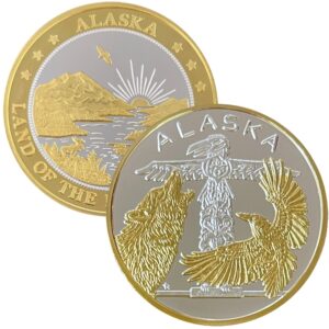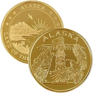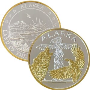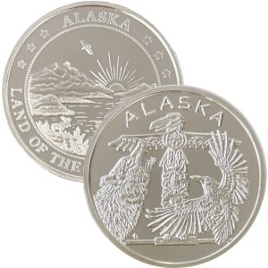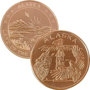 This medallion is available in pure copper, golden bronze, 1 oz .999 fine silver, 1 oz single gold relief (24k plating on the front of the silver coin) and 1 oz double gold relief (24k gold plating on both sides). It is similar in size to a silver dollar and comes packaged in an airtight container and handsome gift box. The reverse features our popular “Land of the Midnight Sun” design.