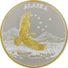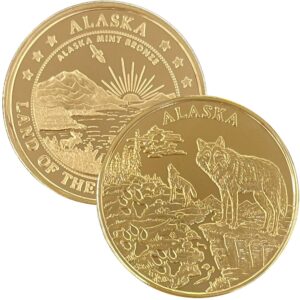 This is a fresh design of our wolf tracks medallion originally designed in the 1990’s. Our Wolf Tracks coin was one of the first medallions in our “Tracks” series which shows many of Alaska’s creatures and the tracks they leave. It features a wolf standing in the foreground with a howling wolf in the background. This medallion is available in golden bronze, pure copper, 1 oz .999 fine silver, 1 oz single gold relief (24k plating on part of the silver coin) and 1 oz double gold relief (24k gold plating on both sides). It is similar in size to a silver dollar and comes packaged in an airtight container and handsome gift box. The reverse features our popular “Land of the Midnight Sun” design.