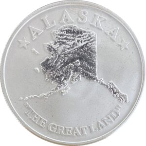 For people that like to collect or “stack” silver, this is our reverse-proof 1 oz. silver Alaska Map medallion, it is struck by our minter once, at a pressure of 150 tons, on our coining press. Reverse-proof means the fields are frosted and the raised area of the Alaska map is polished.