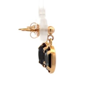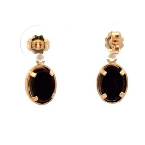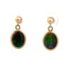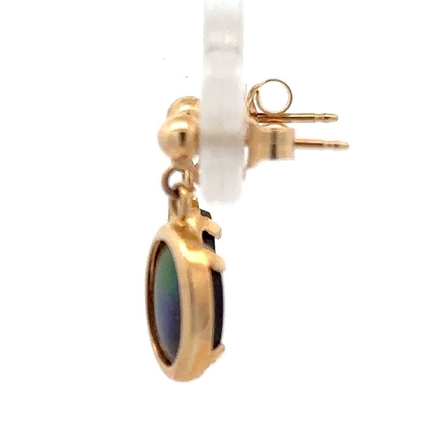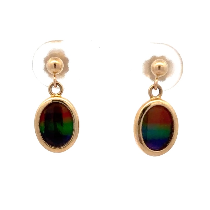 These are small oval ammolite earrings. They are set in 14k yellow gold. It measures 7mm wide and 9mm tall. Each pair of earrings are handmade, and none are exactly alike.