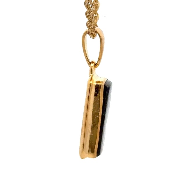 This is a vermeil rectangle ammolite pendant. It is sterling silver with a thick gold plating. It measures 11mm wide and 31mm tall, including the bail. Each pendant is handmade, and none are exactly alike. This piece comes with a 18in display chain.
