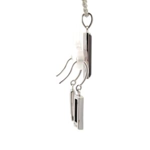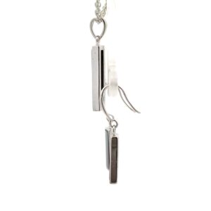 This is a small sterling silver rectangle ammolite pendant with a matching set of small rectangle ammolite earrings. The pendant measures 7mm wide and 27mm tall, including the bail. The earrings measure 7mm wide and 26mm tall, including the wire. Each pendant and earring is handmade, and none are exactly alike. This piece comes with a 18in display chain.