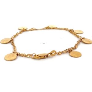 Check out this beautiful estate bracelet featuring a tiny gold replica Morgans. This bracelet is 7″ long and weighs 5 grams.