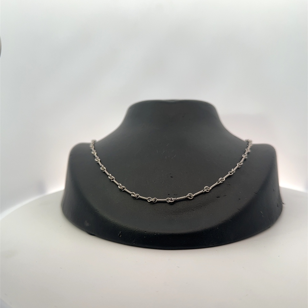 This chain measures 24 inches long. It is platinum & weighs 12.4 grams. This piece features a lobster claw clasp safety mechanism.