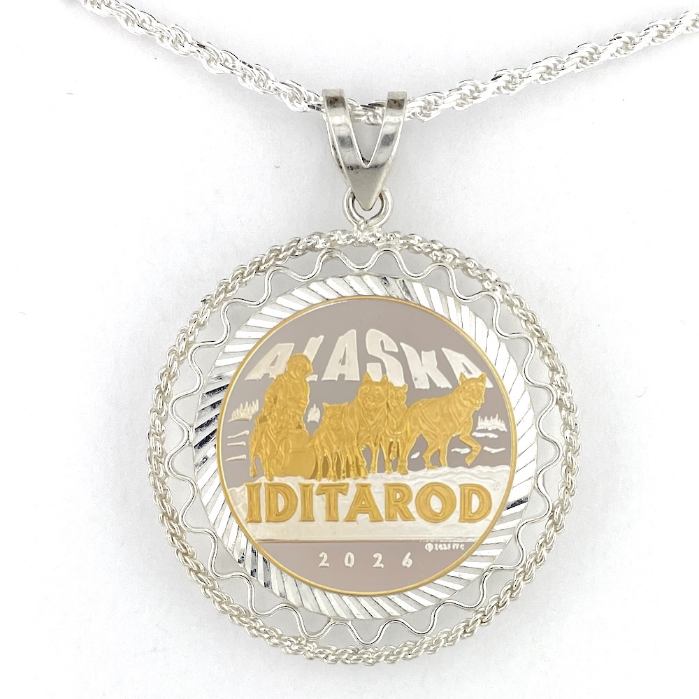 This official Iditarod 1/4 oz .999 fine silver coin pendant has a sterling silver bezel. The sterling silver rope chain is 20″. The coin is .999 fine silver with 24k plating on part of the image. Help support Iditarod by purchasing this beautiful Iditarod souvenir.