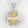 This 1/10 oz .999 fine silver coin pendant has a sterling silver bezel. The sterling silver wheat chain is 18″. The coin is .999 fine silver with 24k plating on part of the image.