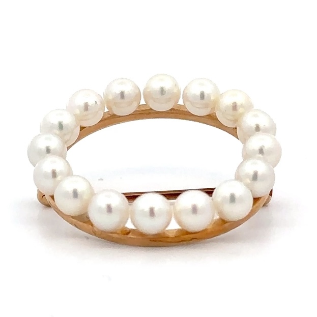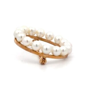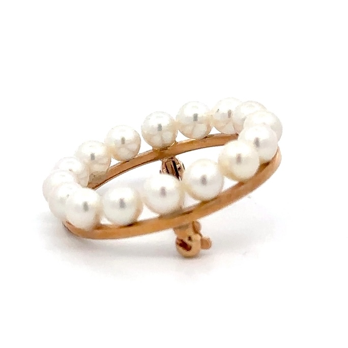 This estate pin features 4.2mm pearls. It is mounted in a 4.2 gram 14k setting. It is approximately 23mm tall.