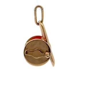 This 14k fishing reel with red string charm weighs 2.5 grams and is 18mm tall and 8mm wide. The tiny handle reels in the red line.