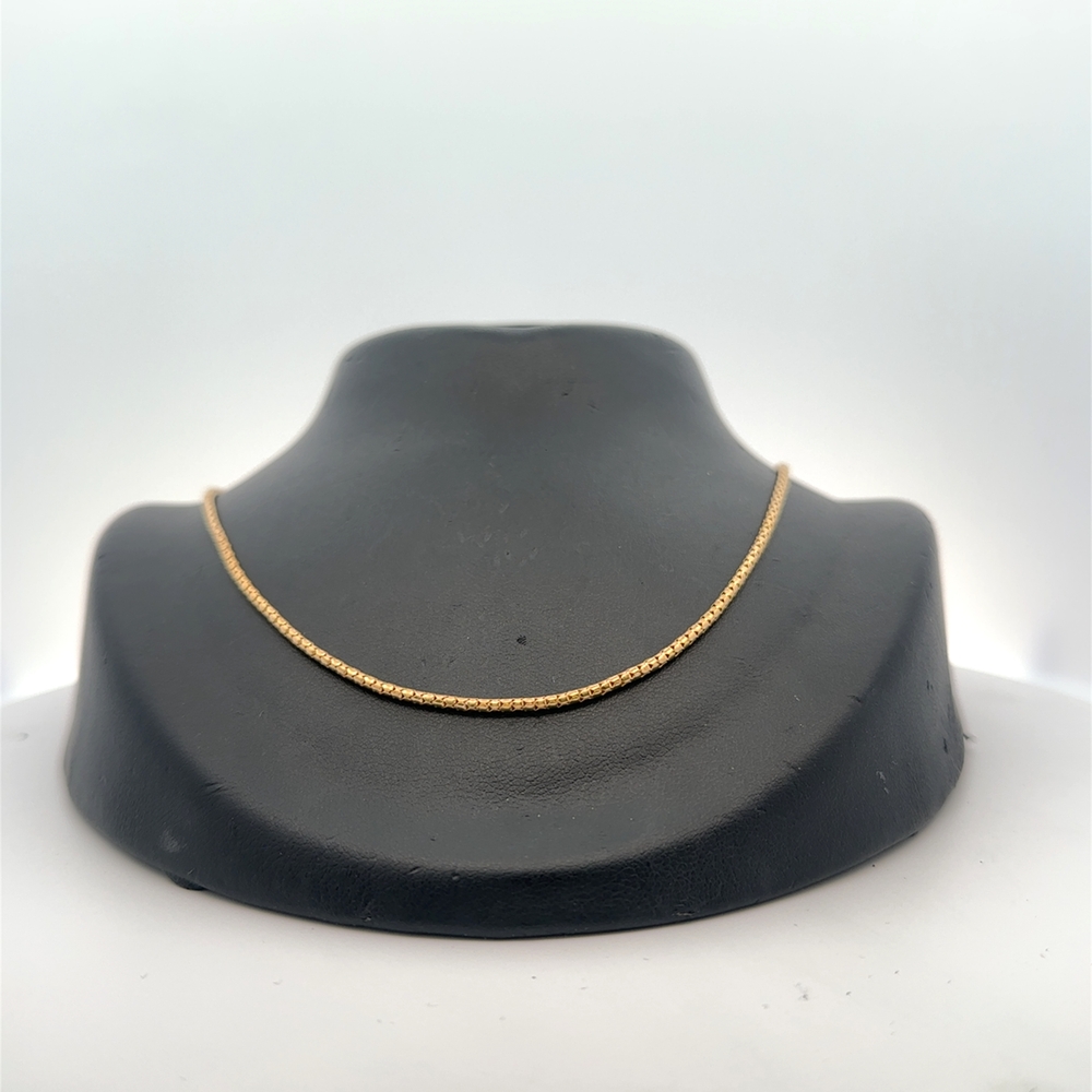 This estate chain measures 18 inches long. It is 14k gold & weighs 4.1 grams. This piece features a lobster claw clasp.