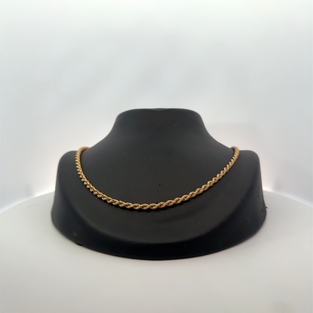 This estate chain measures 16 inches long. It is 14k gold & weighs 11.4 grams. This piece features a barrel safety latch.