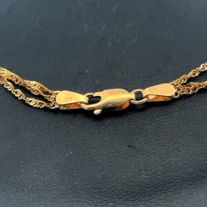 This estate chain measures 20 inches long. It is 14k gold & weighs 4.2 grams. Each strand is about 1mm wide. This piece features a lobster claw clasp safety mechanism.