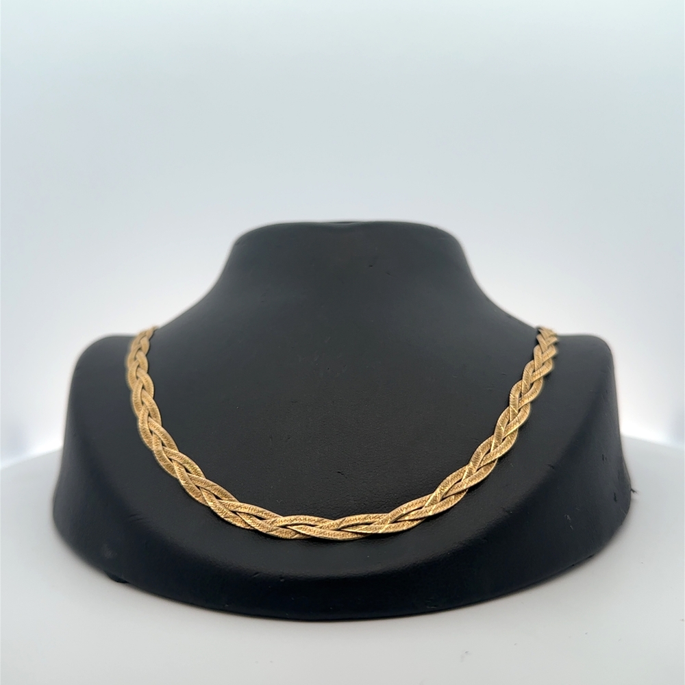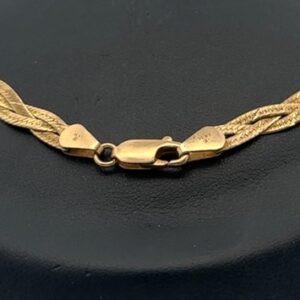 This estate chain measures 16 inches long. It is 14k gold & weighs 7.5 grams. This piece features a lobster claw clasp.