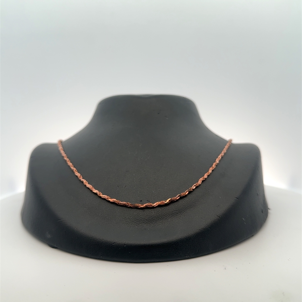 This estate chain measures 22 inches long. It is 14k rose gold & weighs 4.2 grams. This piece features a lobster claw clasp.