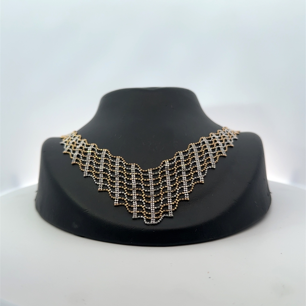 This estate chain measures 17 inches long, it is about 9mm wide in the back and tapers up to 31mm at the front of the “V” shape. It is 14k two-tone white and yellow gold & weighs 13.2 grams. This piece features a lobster claw clasp.