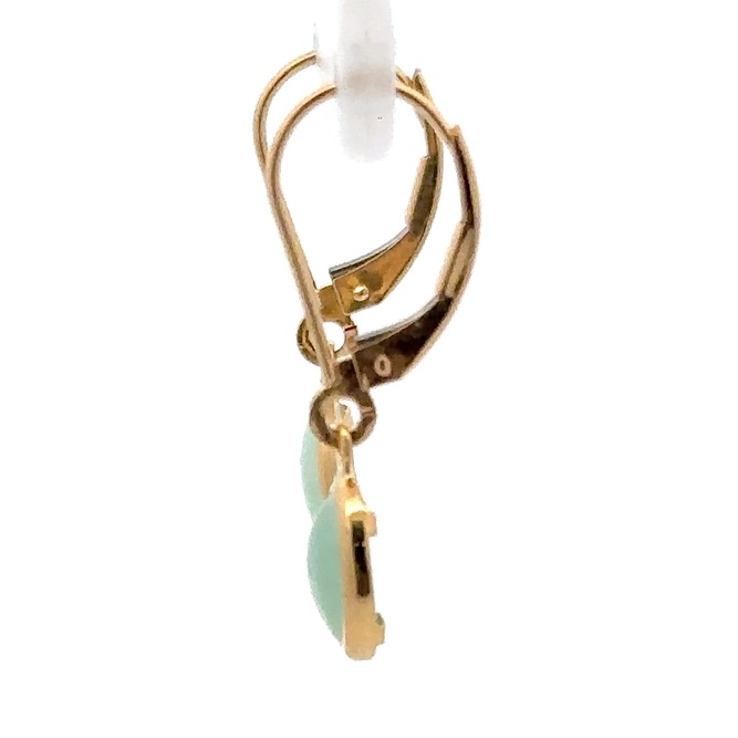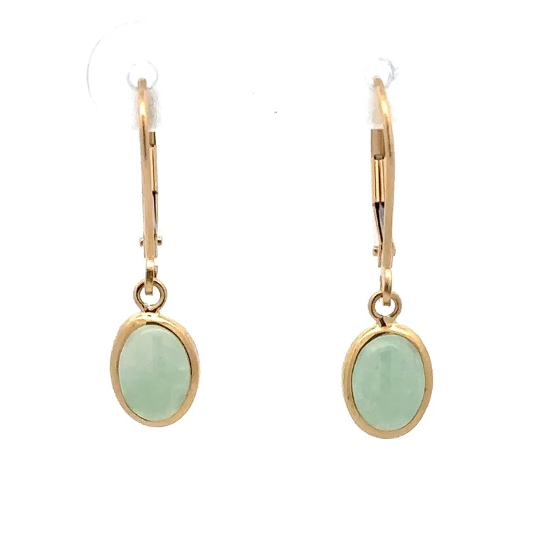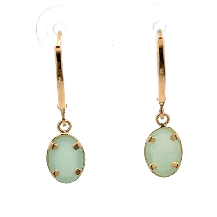 These 14k jade dangling earrings are a beautiful pair to add to your collection. These earrings feature a light colored jade stone. The earrings weigh about 1.3 grams. The earrings measure 9mm tall and 4mm wide.