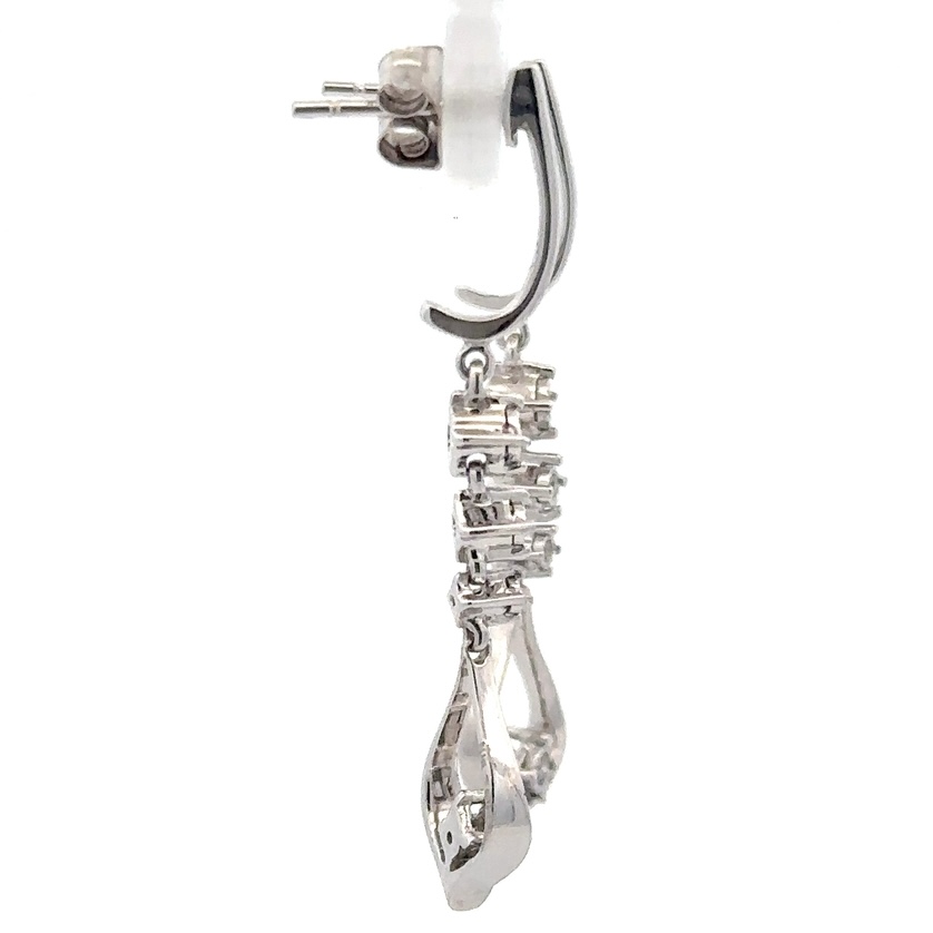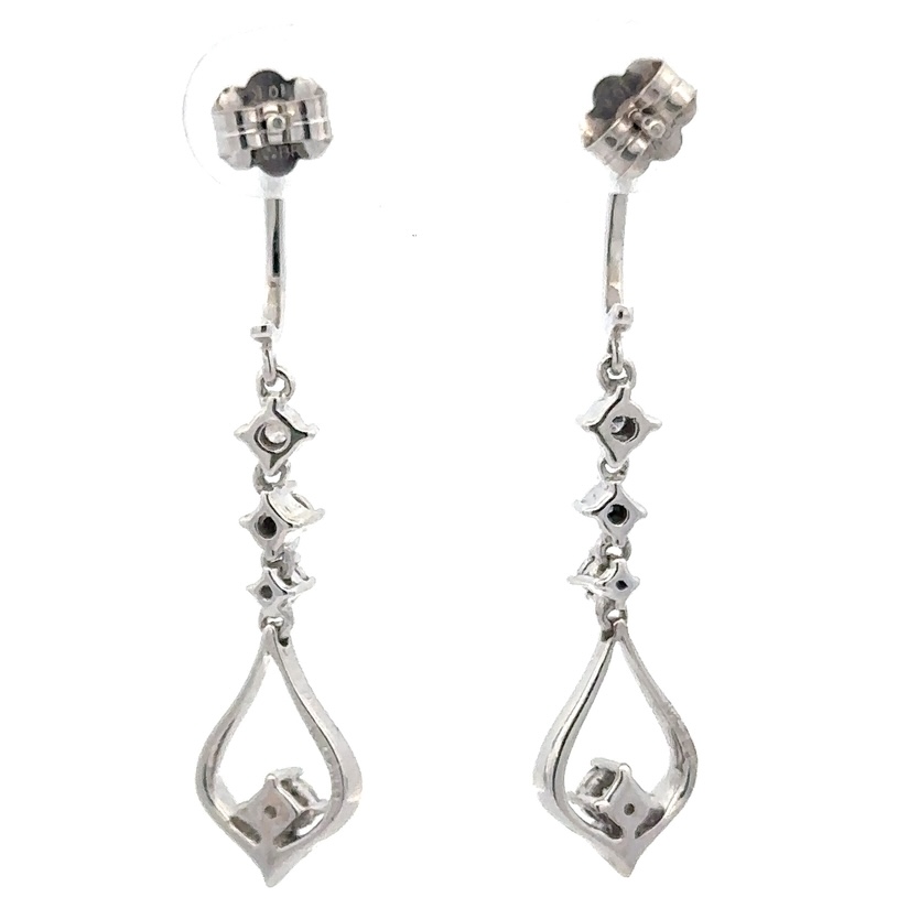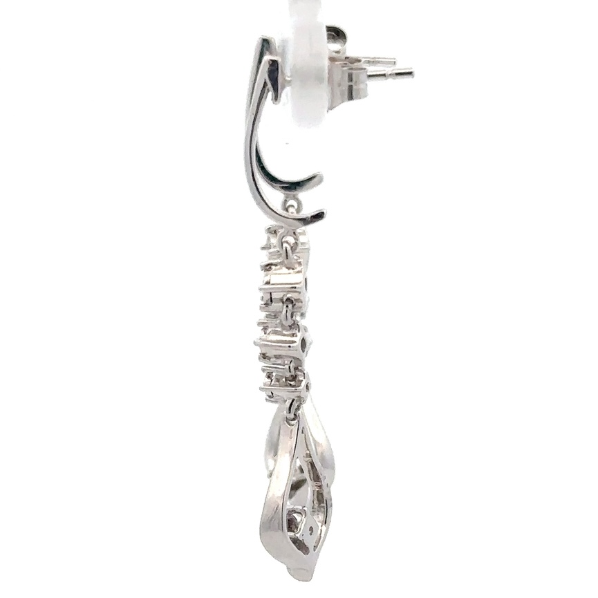 These 10k white gold, .12ct diamond earrings are a beautiful pair to add to your collection. The earrings weigh about 2.7 grams. The earrings measure 36mm tall and 5mm wide.