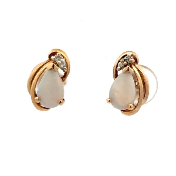 These opal earrings are a beautiful pair to add to your collection. The earrings are set in 2.4 grams of 14k gold and have .04ct of diamonds. The earrings measure 9mm tall and 4mm wide.