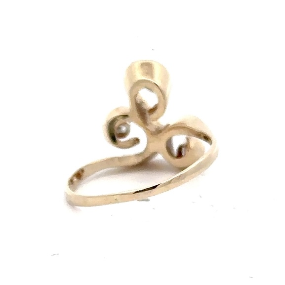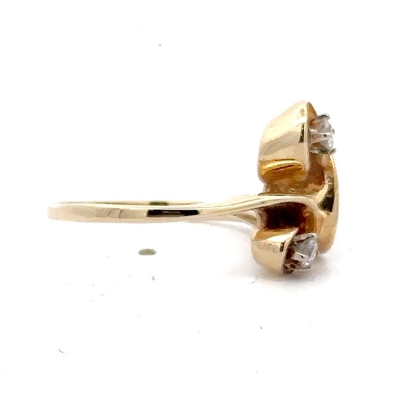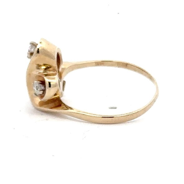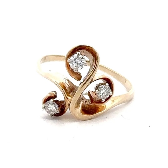 This lady’s estate ring features .15-carat diamonds, clarity SI, and color H-I. It is mounted in 3.4 grams of 14k yellow gold. Ring size 6.5.