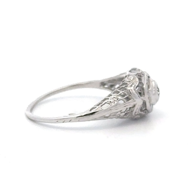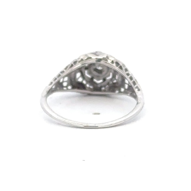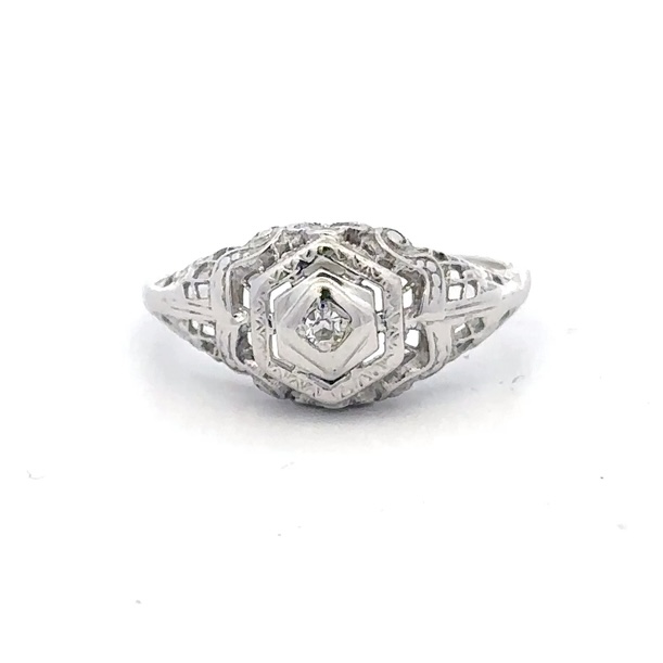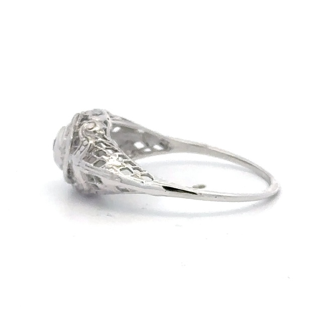 This lady’s estate ring features .03 carats of diamonds. It is mounted in 2.3 grams of 14k white gold. Ring size 8.