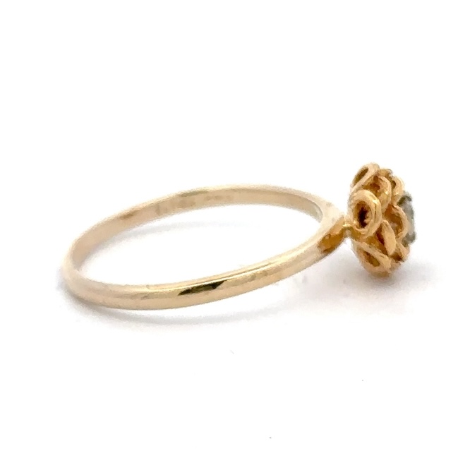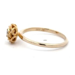 This lady’s estate ring features a .10-carat diamond, clarity SI, and color H-I. It is mounted in 2.9 grams of 14k yellow gold. Ring size 8.