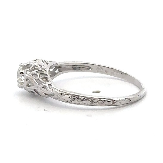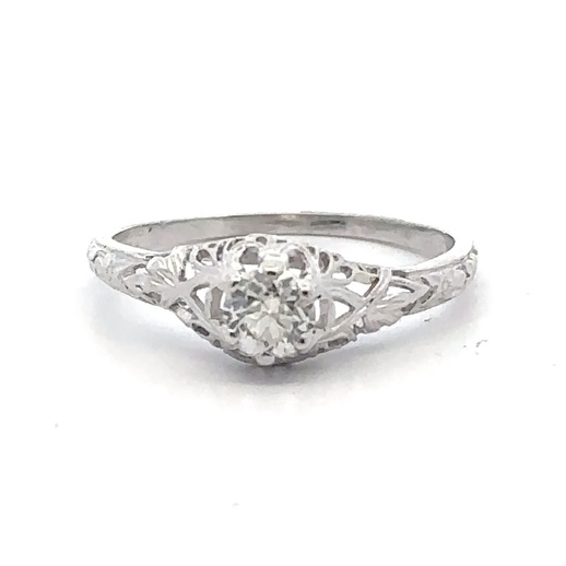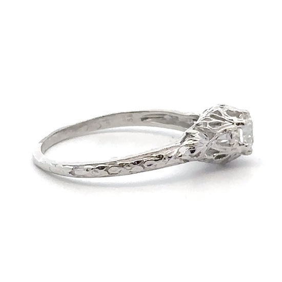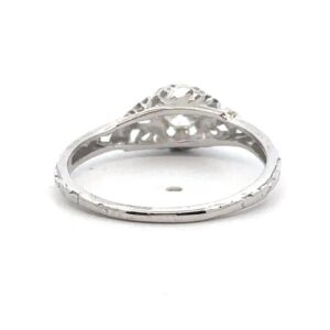 This lady’s estate ring features .38-carats of eurocut diamonds, clarity SI, and color G. It is mounted in 2.8 grams of platinum. Ring size 7.5.