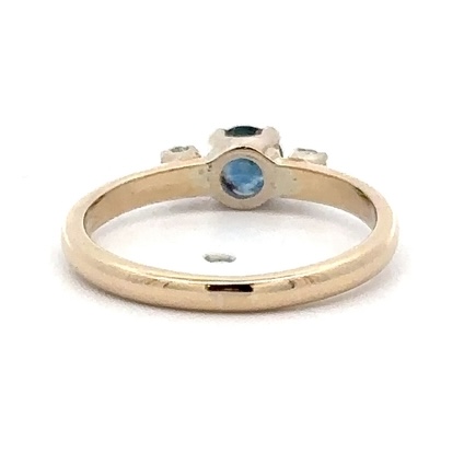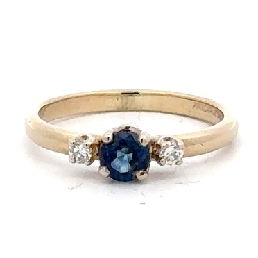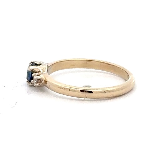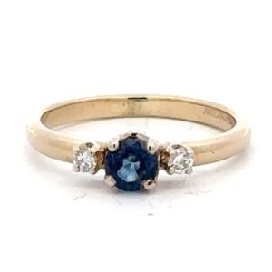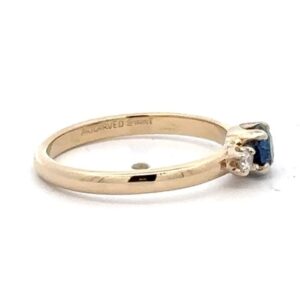 This lady’s estate ring features a .28-carat sapphire, surrounded by .06ct of diamonds, clarity VS, and color H-I. It is mounted in 1.5 grams of 14k yellow gold. Ring size 3.75.