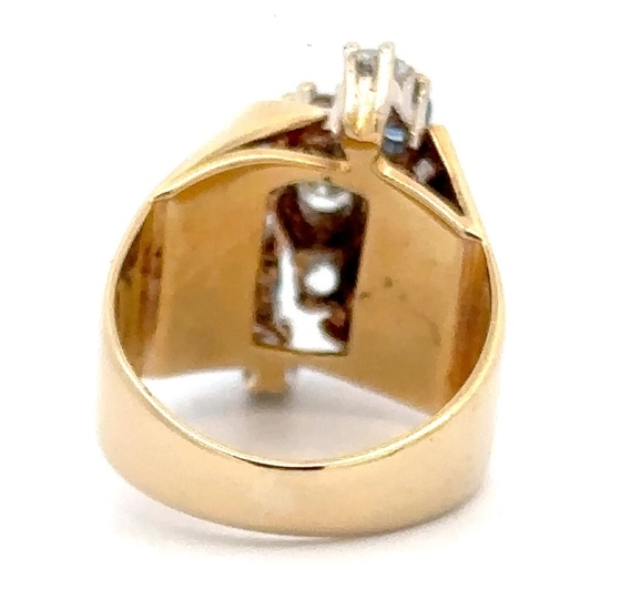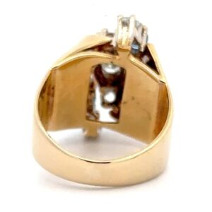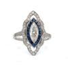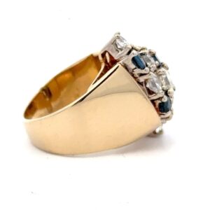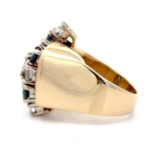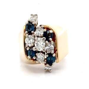 This lady’s estate ring features .74-carat sapphires, surrounded by 1.09ct of diamonds, clarity VS, and color G-H. It is mounted in 11.8 grams of 18k yellow gold. Ring size 5.5.