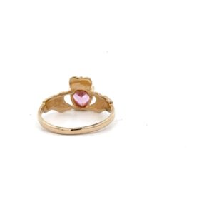 This lady’s estate ring features a synthetic pink cubic zirconia. It is mounted in 2.1 grams of 14k yellow gold. Ring size 6 1/4.
