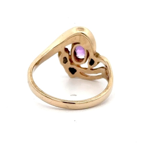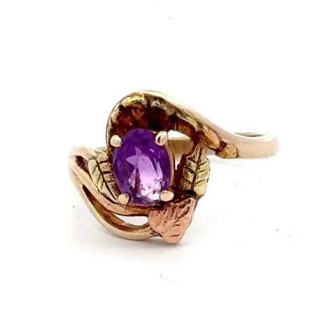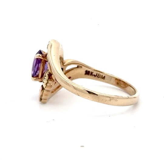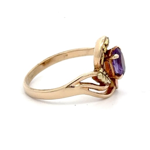 This lady’s estate ring features an amethyst, accented with Alaska nuggets and Black Hills Gold leaves. It is mounted in 3.7 grams of 10k yellow gold. Ring size 7 2/4.