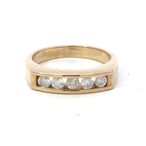 This estate diamond band features .50 carat total weight diamonds channel set in a 14k yellow gold ring weighing 6.1 grams. Ring size 8.