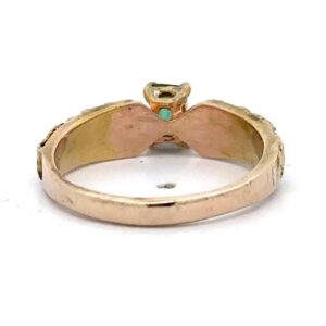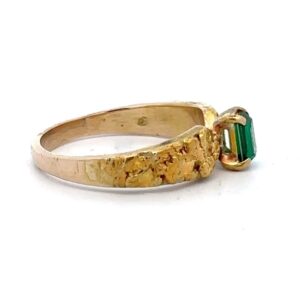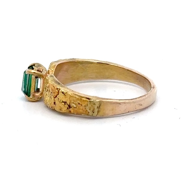 This lady’s estate ring features a synthetic spinel triplet, surrounded by Alaskan gold nuggets. It is mounted in 3.9 grams of 14k yellow gold. Ring size 7.