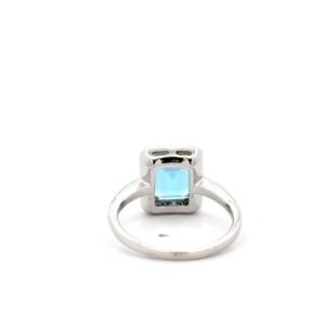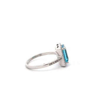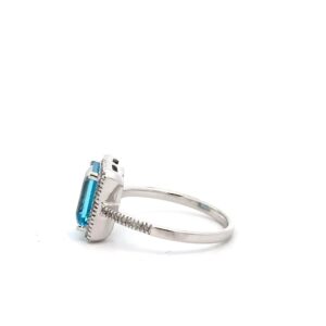 This lady’s estate ring features a beautiful blue topaz, surrounded by .20 ct. of diamonds, clarity SI-I and color H-I-J. Mounted in 3.8 grams of 14k white gold. Ring size 6 3/4.