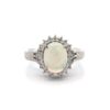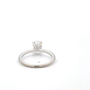 This lady’s estate ring features a 1.0 carat oval cut diamond, clarity I1, and color F. The band has .22 ct. of diamonds, clarity V, S, and color H-I. It is mounted in 2.3 grams of 14k white gold, ring size 7.