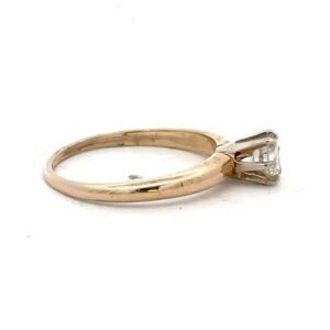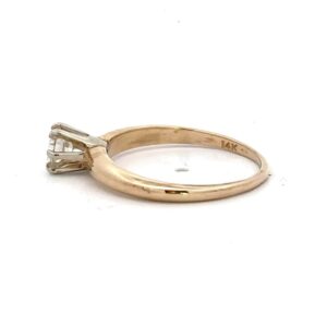 This lady’s estate ring features a .39 carat diamond with a clarity of VS1 and color L. It is mounted in 2.3 grams of 14k yellow gold. Ring size 6 3/4.
