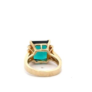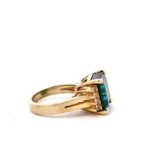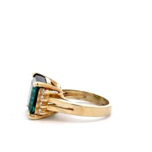 This lady’s 14k gold ring features a 5.25 carat green tourmaline. along with .24 ct of diamonds- SI H-I. Weighs 7.7 grams. Size 5.5.
