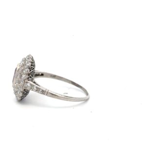 This lady’s estate ring features a 1.45 carat pink sapphire, surrounded by .89 carat total weight in Euro cut diamonds, clarity VS2-SI, and color G-H-I. They are all mounted in 4.4 grams of platinum. Ring size 7 1/2.