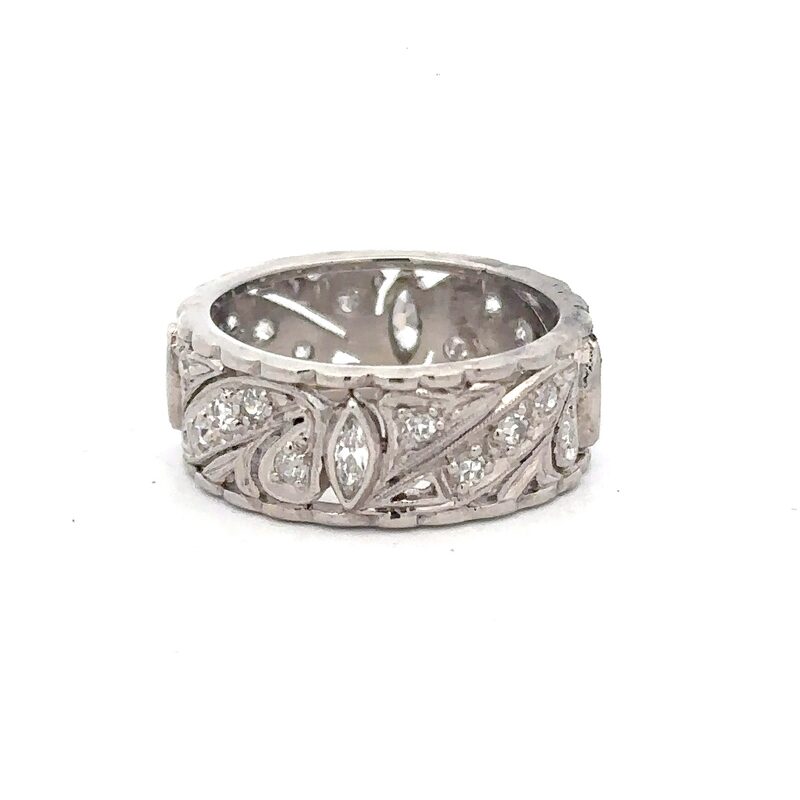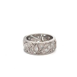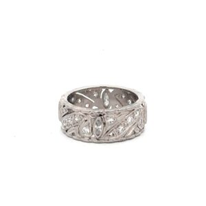 This lady’s estate band features .74 ct. of diamonds, clarity VS2-SI, and color H-I. They are mounted in 6.7 grams of platinum. Ring size 6.