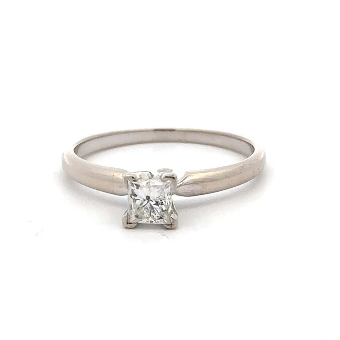 This lady’s estate ring features a .45 carat princess cut diamond, clarity I1, and color I. It is mounted in a 2.1-gram 14k white gold ring size 7.
