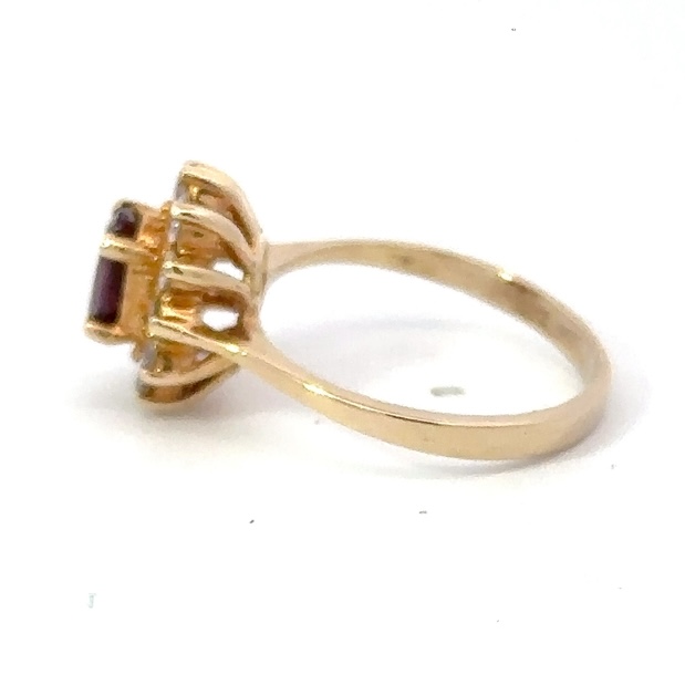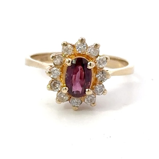 This lady’s estate ring features a .55 carat ruby, surrounded by .24 ct. of diamonds, clarity I and color H-I-J. It is mounted in 2.4 grams of 14k yellow gold. Ring size 4 1/4.