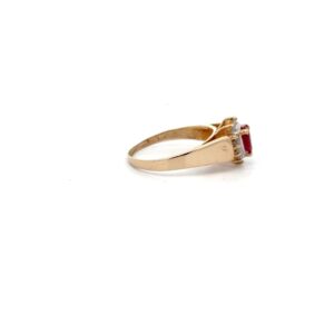 This lady’s estate ring features a .50 carat pear shape ruby, surrounded by .12 ct. of diamonds, clarity I and color H-I-J. It is mounted in 2.9 grams of 10k yellow gold. Ring size 7.