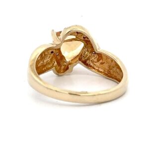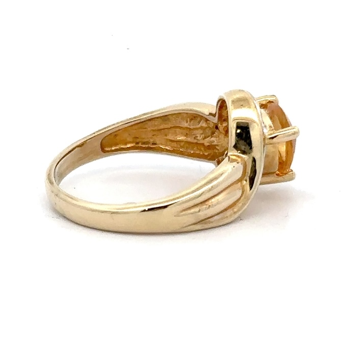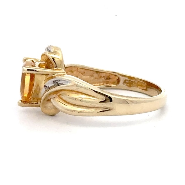 This lady’s estate ring features a 1.10ct citrine, accompanied by .02 ct. of diamonds. It is mounted in 3.5 grams of 10k yellow gold. Ring size 7.