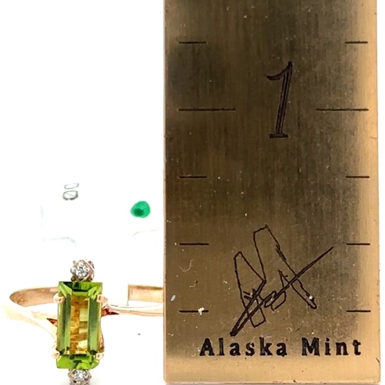 This lady’s estate ring features .85ct peridot, accompanied by .01 ct. of diamonds. It is mounted in 2 grams of 10k yellow gold. Ring size 7.